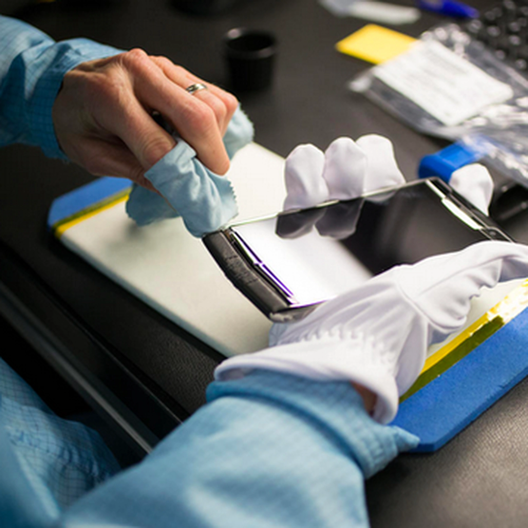 Việc vệ sinh được thực hiện bằng dụng cụ và dung dịch chuyên dụng dành cho điện thoại cao cấp.