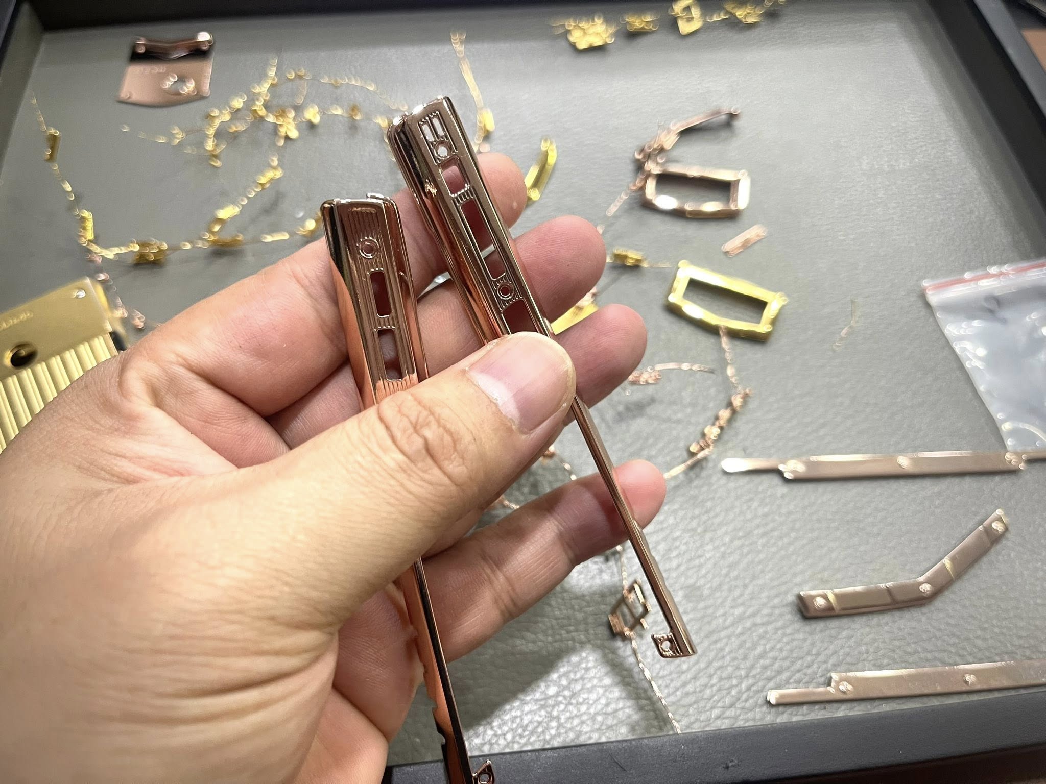 Kỹ thuật viên sẽ tháo các bộ phận kim loại của điện thoại để chuẩn bị cho quá trình mạ vàng.